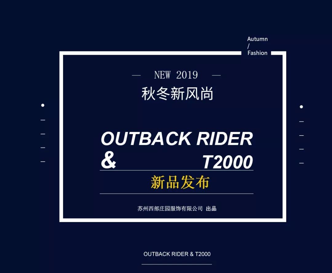 2019年7月3日,苏州西部庄园服饰有限公司发布旗下OUTBACK RIDER品牌、T2000品牌,2019秋冬新品。